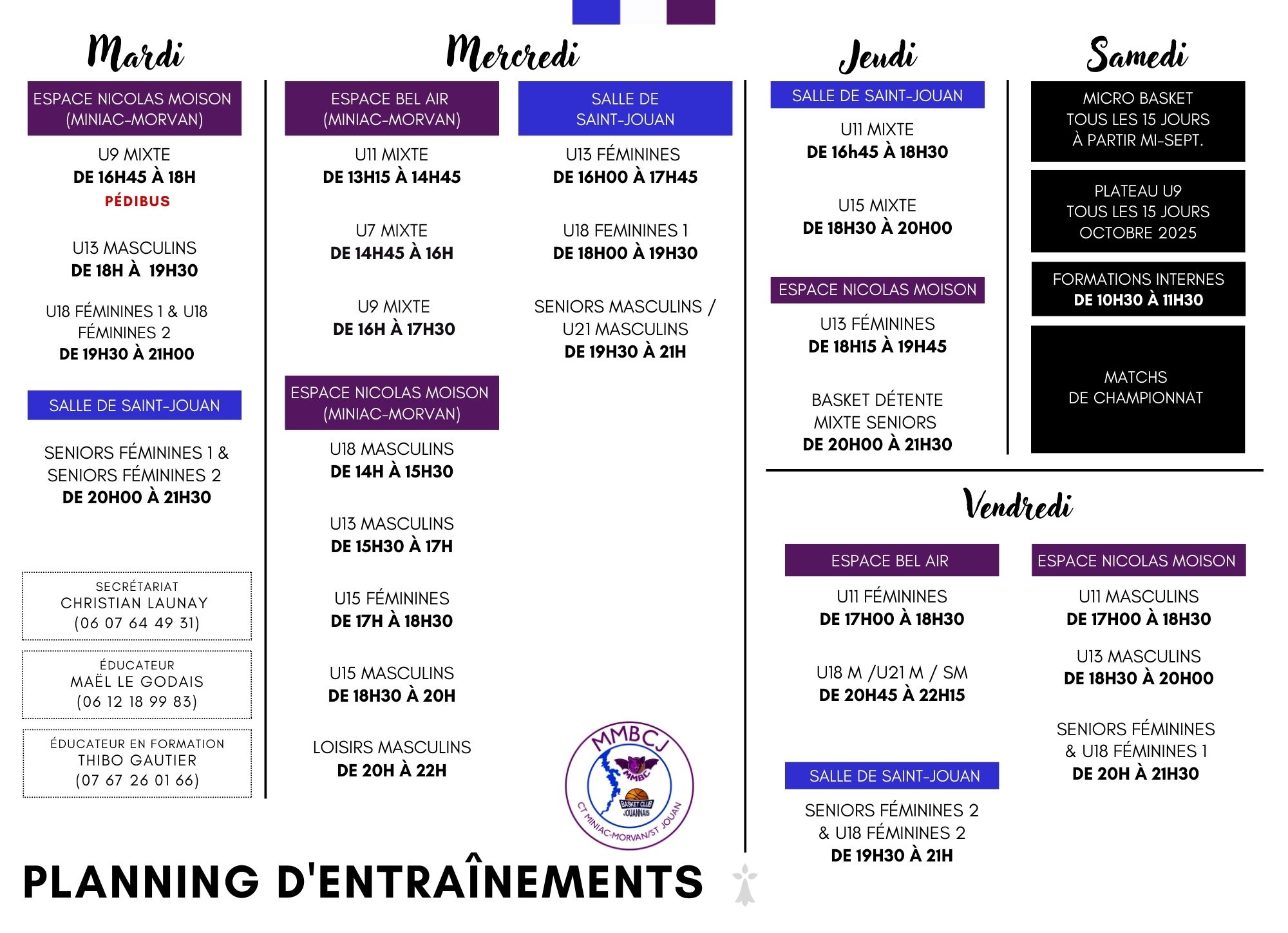 Vous trouverez ci-joint un planning des entraînements par catégorie pour la saison 2025-2026, il sera opérationnel dès le mardi 02 septembre 2025.